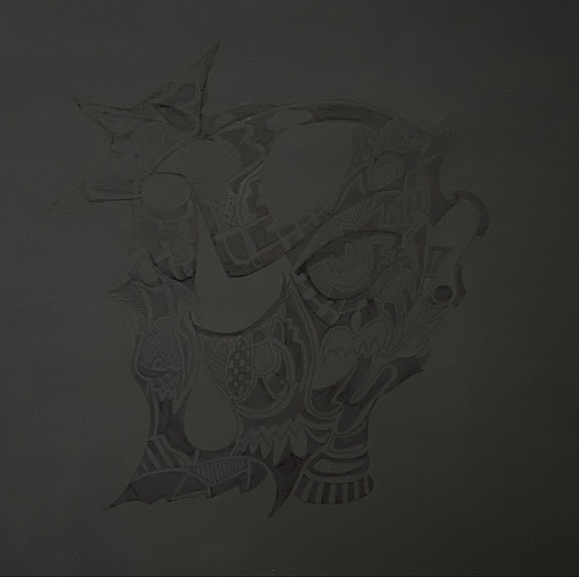 黒の塗料の上に黒の油性ペンで描くことで会場から見たファンの景色とは違い、京子の瞼の裏に焼きついた景色を暗闇の世界で切り取る。
